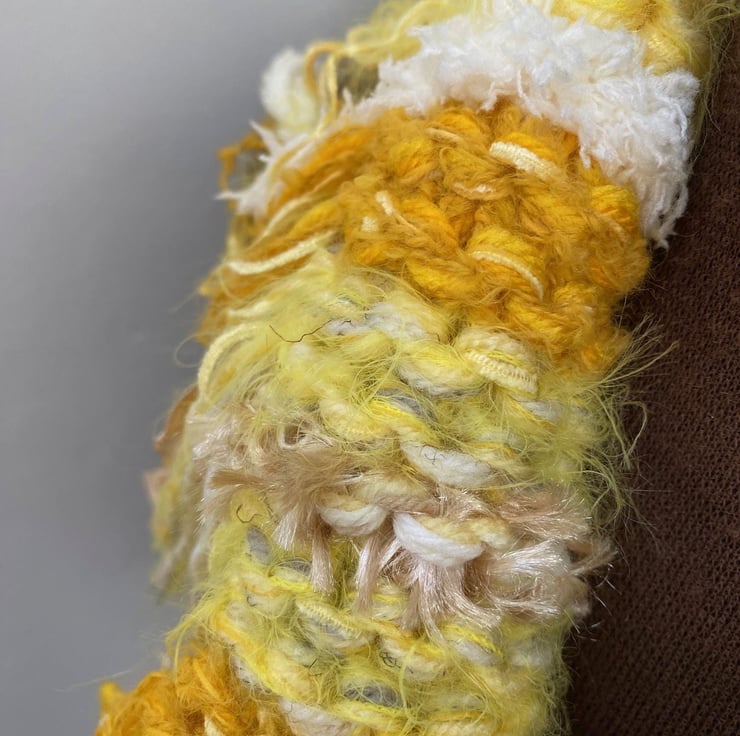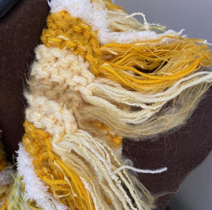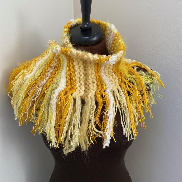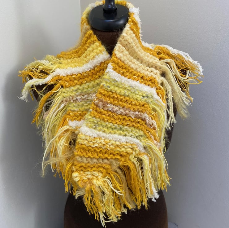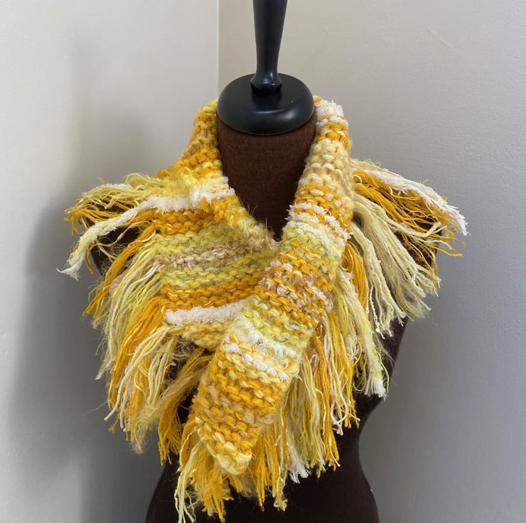 Wrap yourself in cosy style with this one-of-a-kind hand-knitted scarf! Made with a stunning mix of yarns in mixed shades of Yellow, with a splash of gold too all in lots of different textured yarns this scarf is as unique as it is beautiful.