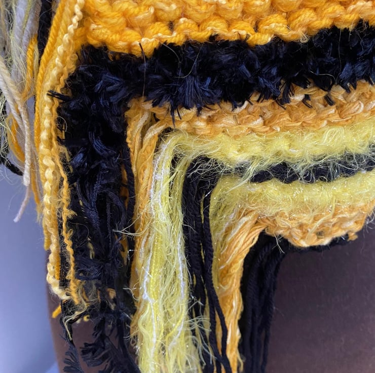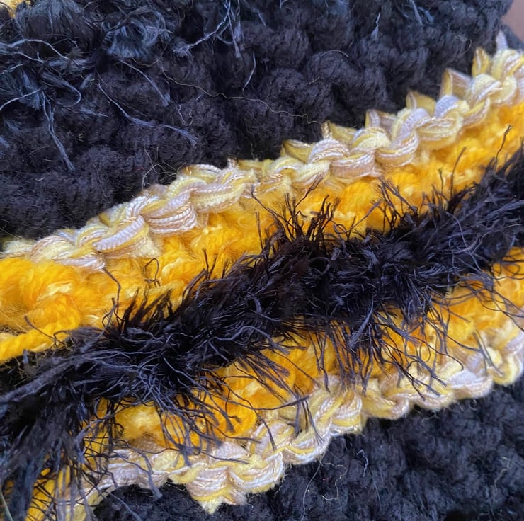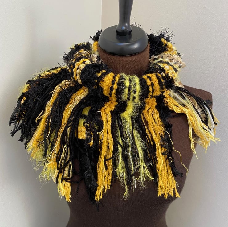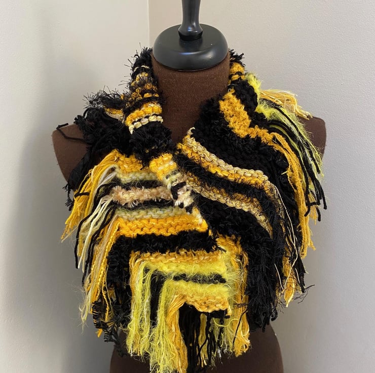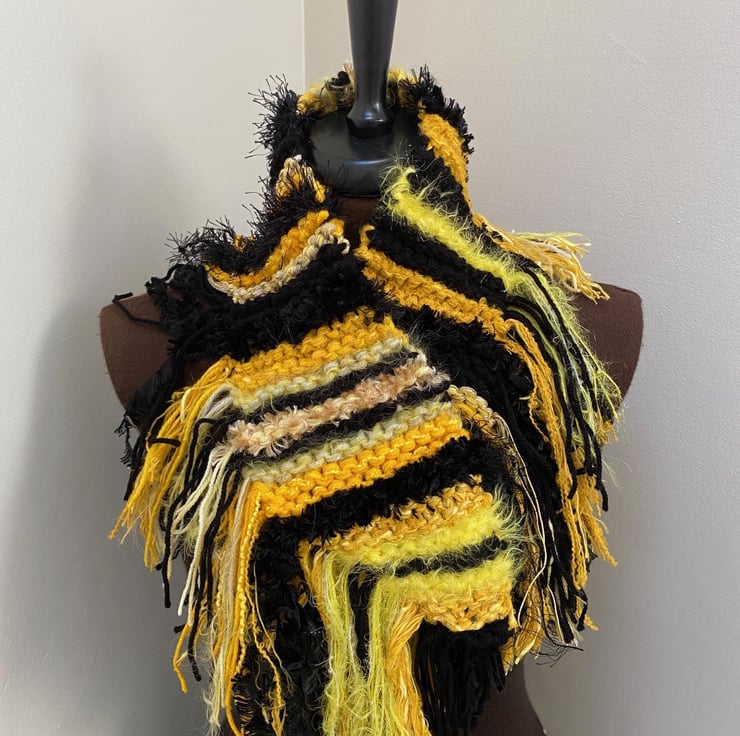 Wrap yourself in cosy style with this one-of-a-kind hand-knitted scarf! Made with a stunning mix of yarns in mixed Black and Yellow, with a splash of gold too all in lots of different textured yarns this scarf is as unique as it is beautiful.