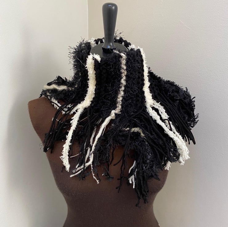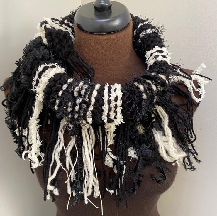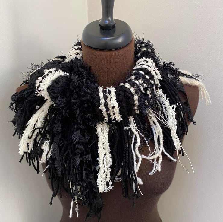 Wrap yourself in cosy style with this one-of-a-kind hand-knitted scarf! Made with a stunning mix of yarns in mixed Black and off white, all in lots of different textured yarns this scarf is as unique as it is beautiful.