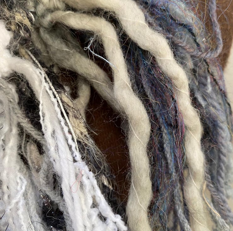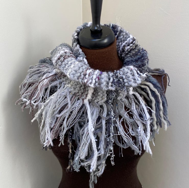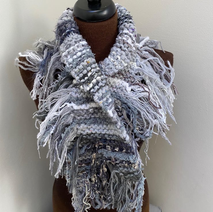 Wrap yourself in cosy style with this one-of-a-kind hand-knitted scarf! Made with a stunning mix of yarns in mixed shades of grey, white and silver sparkle, all in lots of different textured yarns this scarf is as unique as it is beautiful.