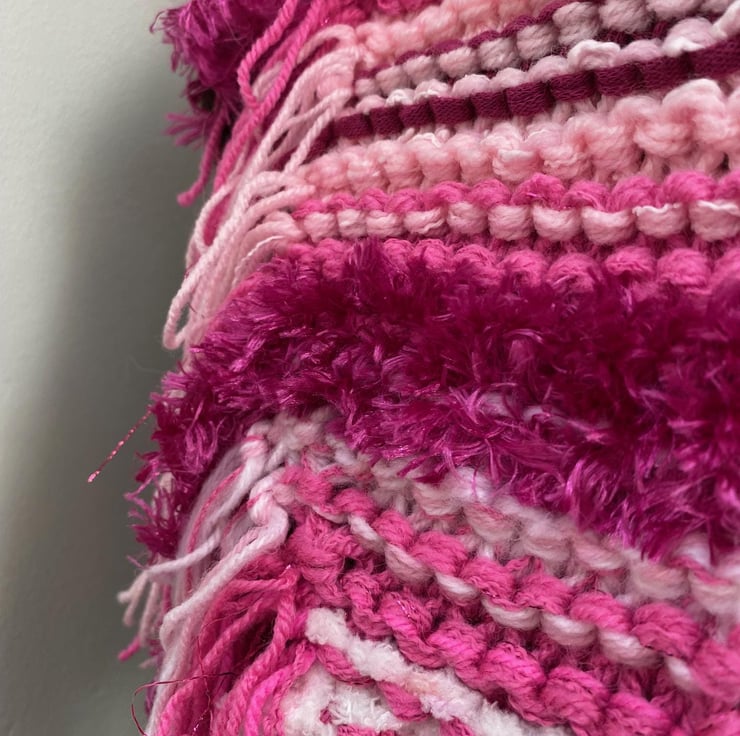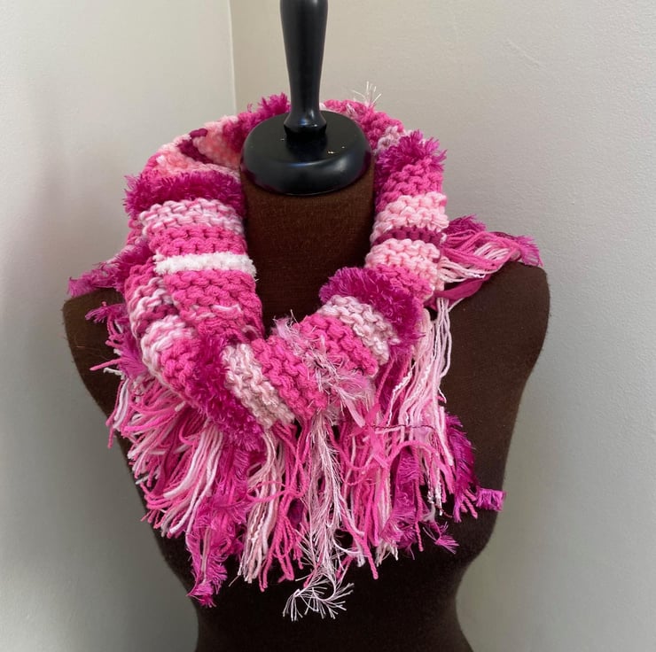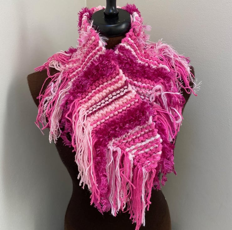 Wrap yourself in cosy style with this one-of-a-kind hand-knitted scarf! Made with a stunning mix of yarns in fabulous mixed shades of pink, burgundy pink with a little pinky sparkle, all in lots of different textured yarns this scarf is as unique as it is beautiful.