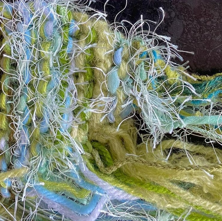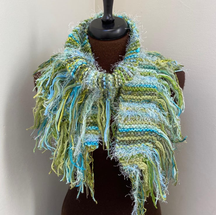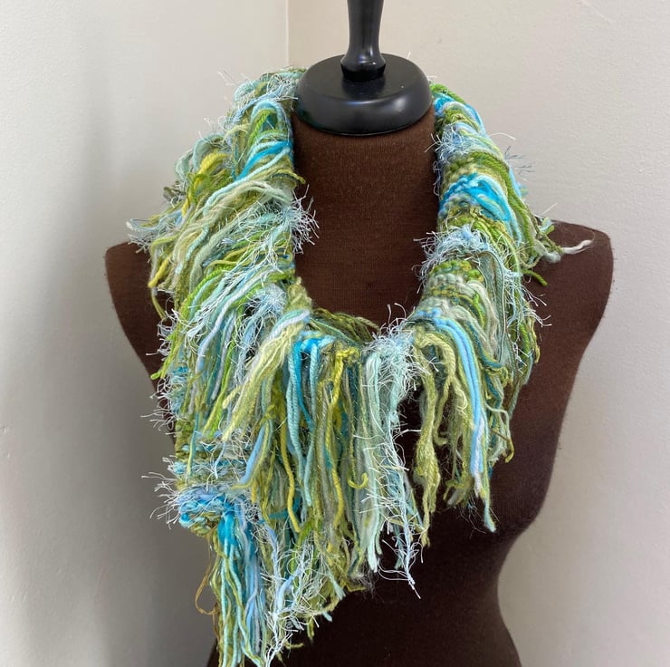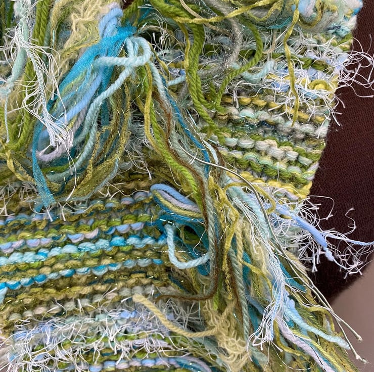 Wrap yourself in cosy style with this one-of-a-kind hand-knitted scarf! Made with a stunning mix of yarns in a mossy mix of blues and greens, this scarf is as unique as it is beautiful.