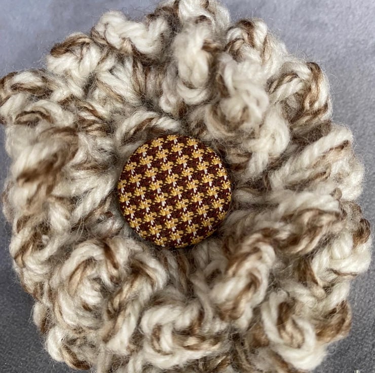 Cute crochet brooch with vintage covered button in the middle. This can be pinned on your coat or bag to coordinate with the scarf or hold the scarf in place.