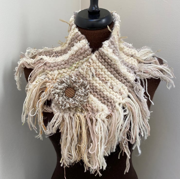 Wrap yourself in cosy style with this one-of-a-kind hand-knitted scarf! Made with a stunning mix of yarns in Golds, Creams, Beige and Brown colours, and some snuggly textured yarns this scarf is as unique as it is beautiful.
