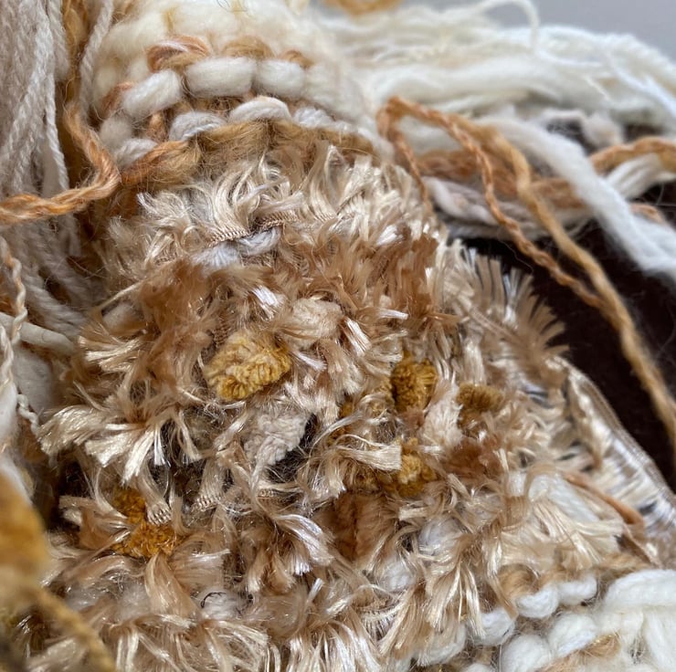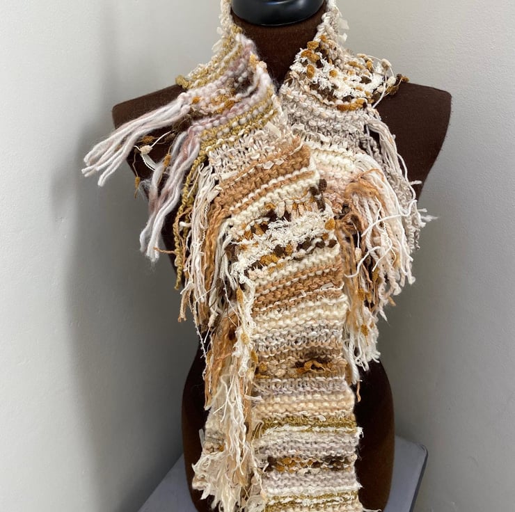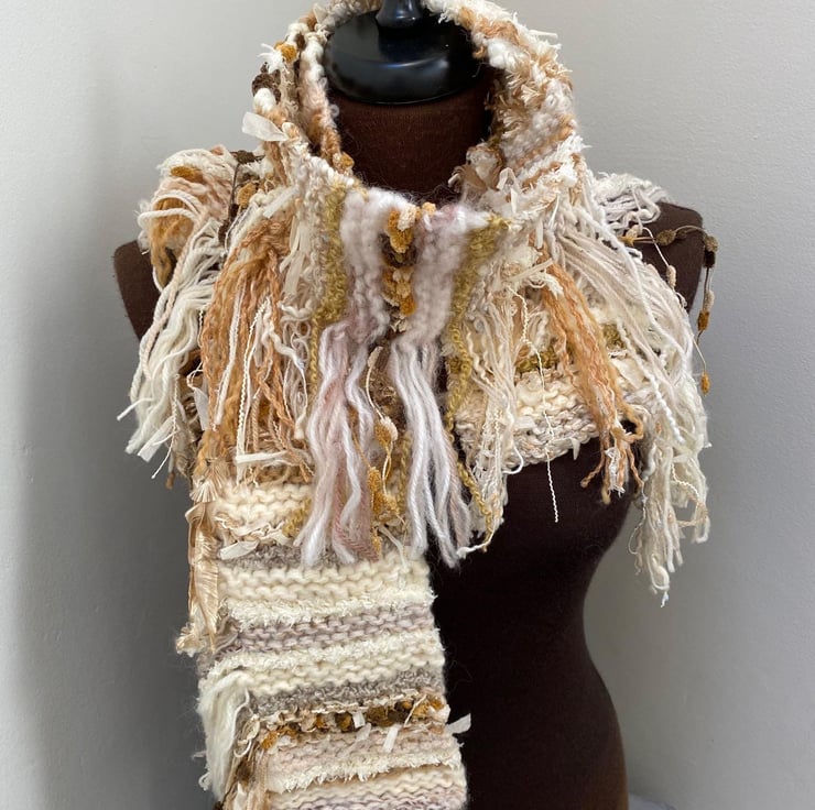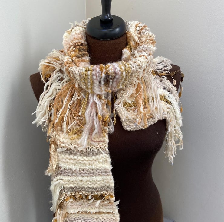Wrap yourself in cosy style with this one-of-a-kind hand-knitted scarf! Made with a stunning mix of yarns in Golds, Creams, Beige and Caramel colours, and some snuggly textured yarns this scarf is as unique as it is beautiful.