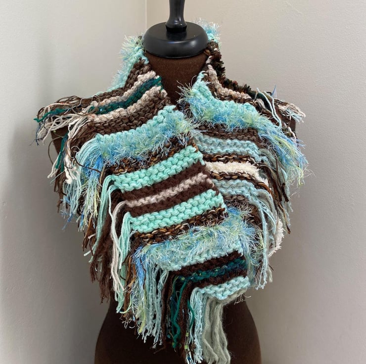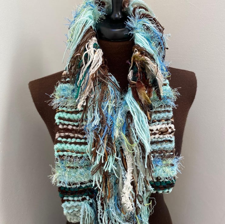 Wrap yourself in cosy style with this one-of-a-kind hand-knitted scarf! Made with a stunning mix of yarns in Chunky Mint Choc Chip inspired, Browns, Blues, Greens, mint, and just a hint of sparkle this scarf is as unique as it is beautiful.