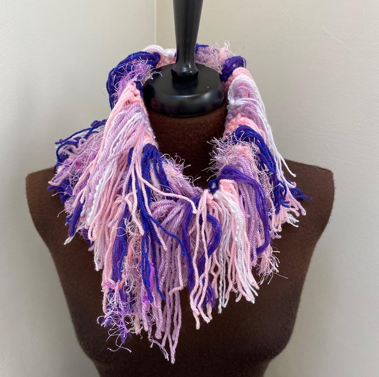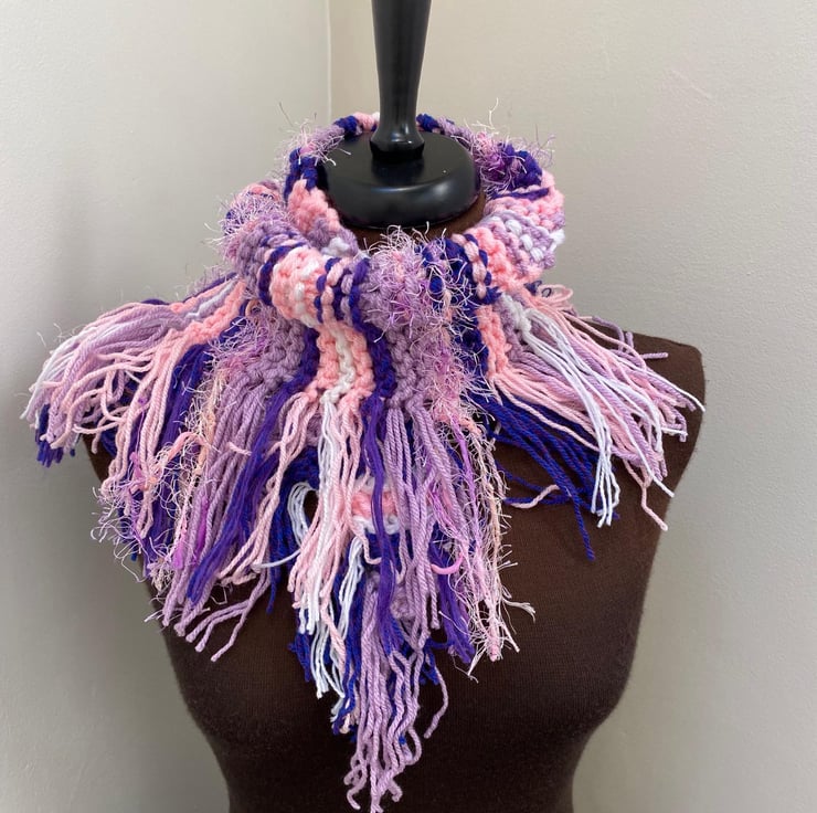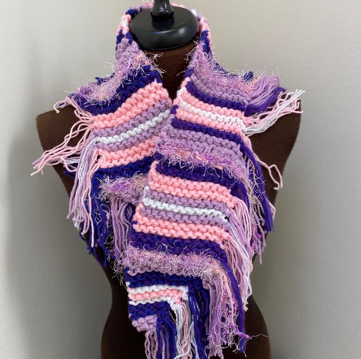 Wrap yourself in cosy style with this one-of-a-kind hand-knitted scarf! Made with a stunning mix of yarns in Purple, lilacs, Pink, Blue, white, silver, and just a hint of sparkle this scarf is as unique as it is beautiful.