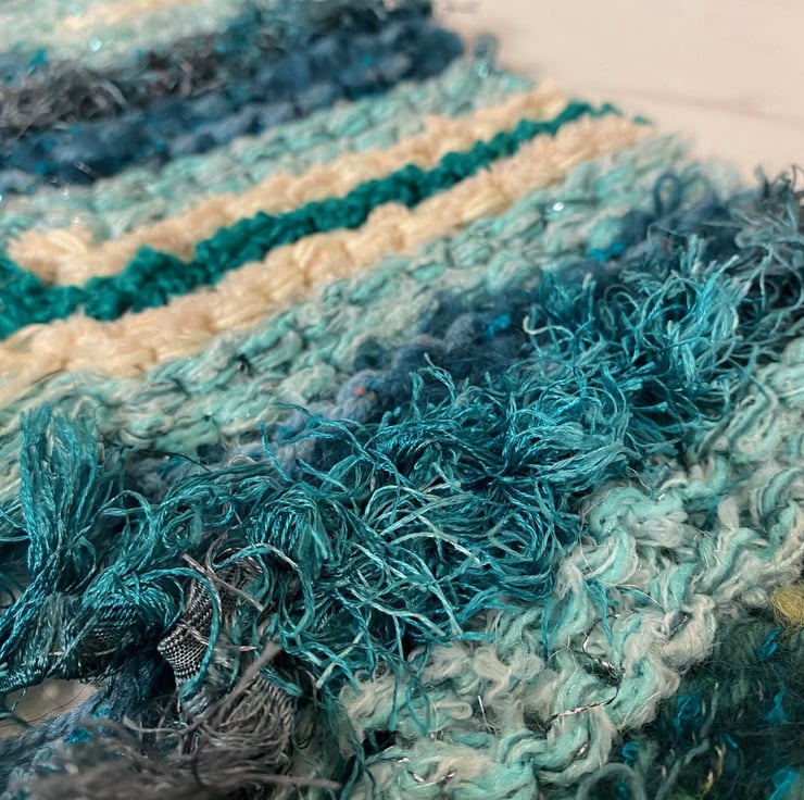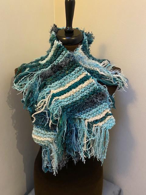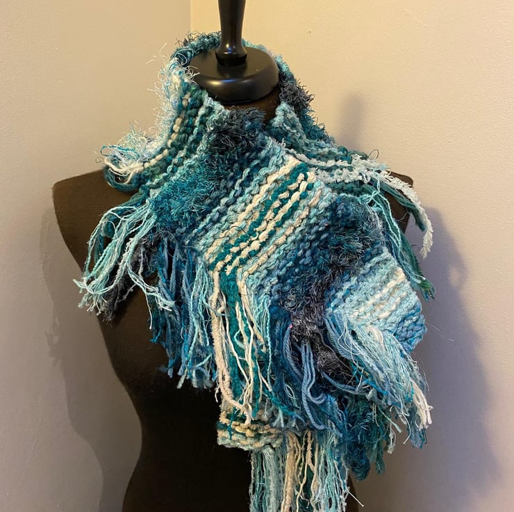 Wrap yourself in cosy style with this one-of-a-kind hand-knitted scarf! Made with a stunning mix of yarns in ocean-inspired hues blues, turquoise, greens, and just a hint of sparkle this scarf is as unique as it is beautiful.