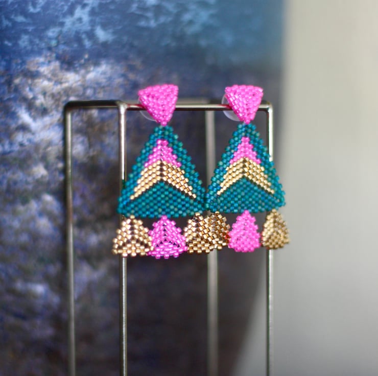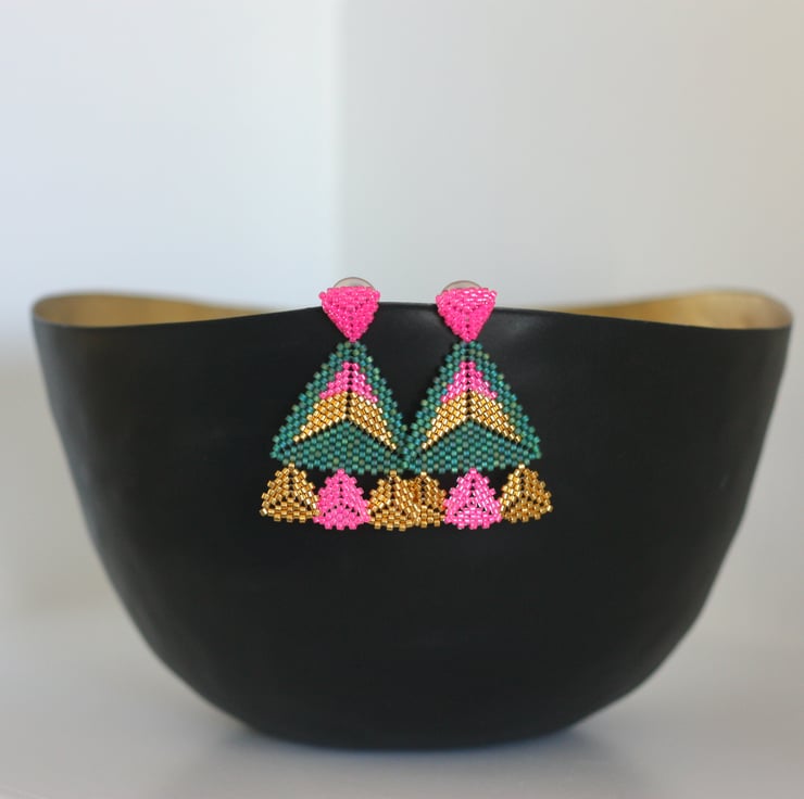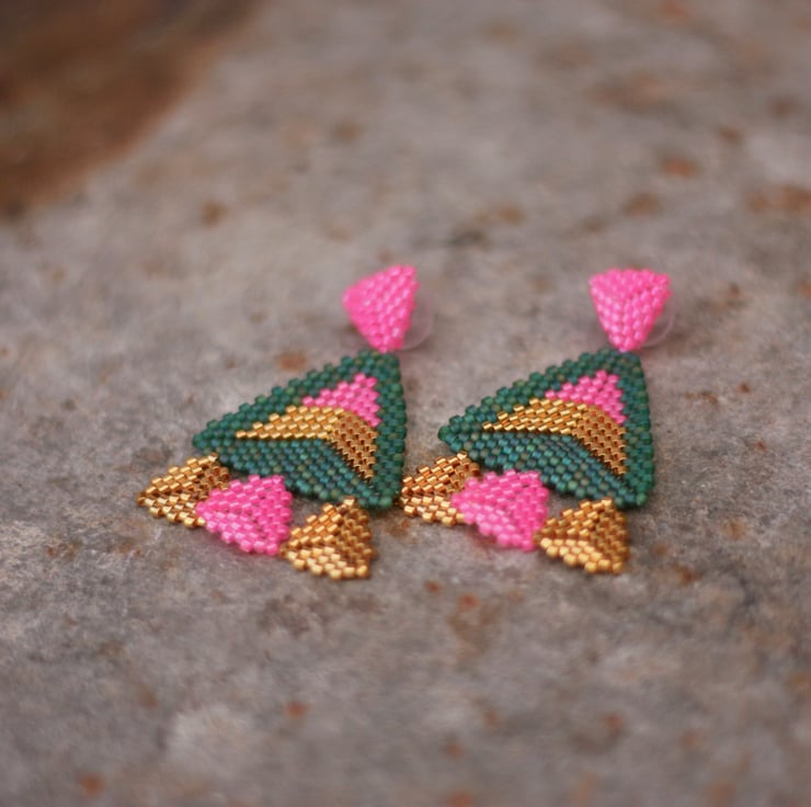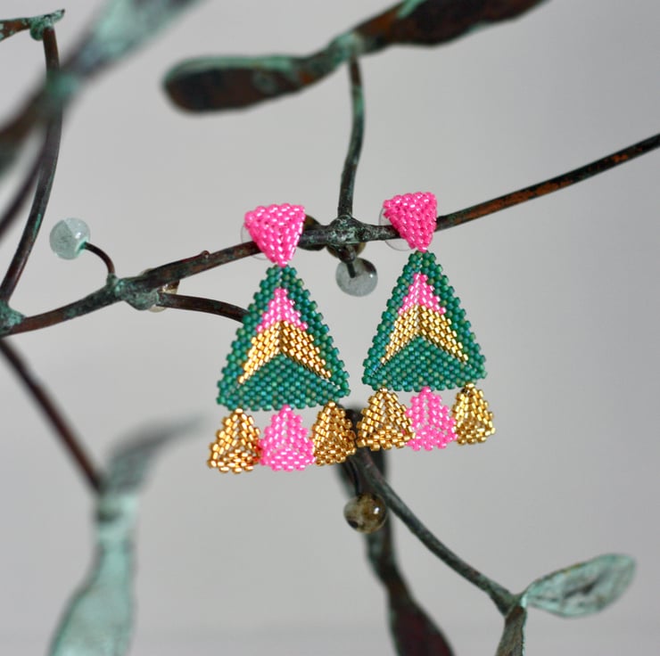 Striking hand beaded drop earrings in a beautiful colour combination of emerald green, pink and 24kt gold plated Miyuki beads.