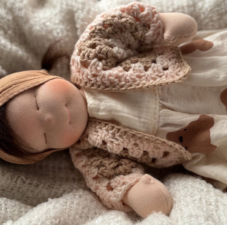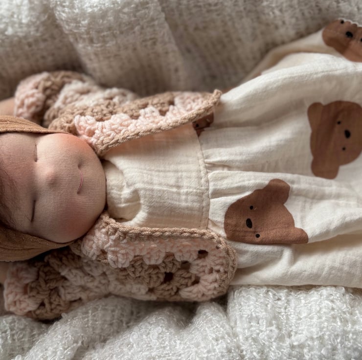 SHe has a cute belly button she comes dressed in a nappy ,socks,muslin teddy dress with matching hairband and hand crocheted granny square cardigan and mini Waldorf cuddle doll 5” long