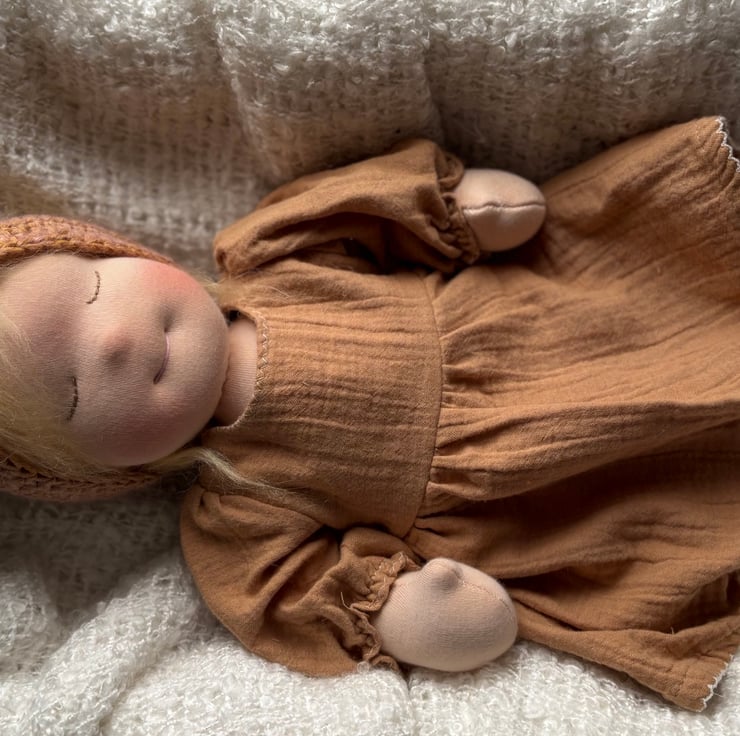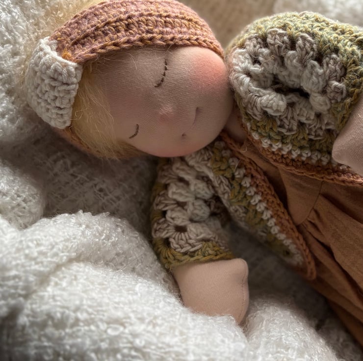 SHe has a cute belly button she comes dressed in a nappy ,socks,muslin brown dress with crochet hairband and hand crocheted granny square cardigan