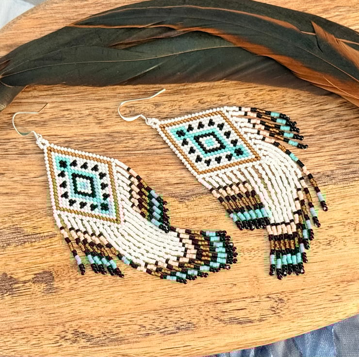 Native American inspired fringe earrings. These earrings have been handmade with tiny Japanese Miyuki beads that are hand woven together to create these earrings. The pattern has a Southwestern feel and is in subtle colours of shimmering white, black, bronze, pale blue and pale pink.