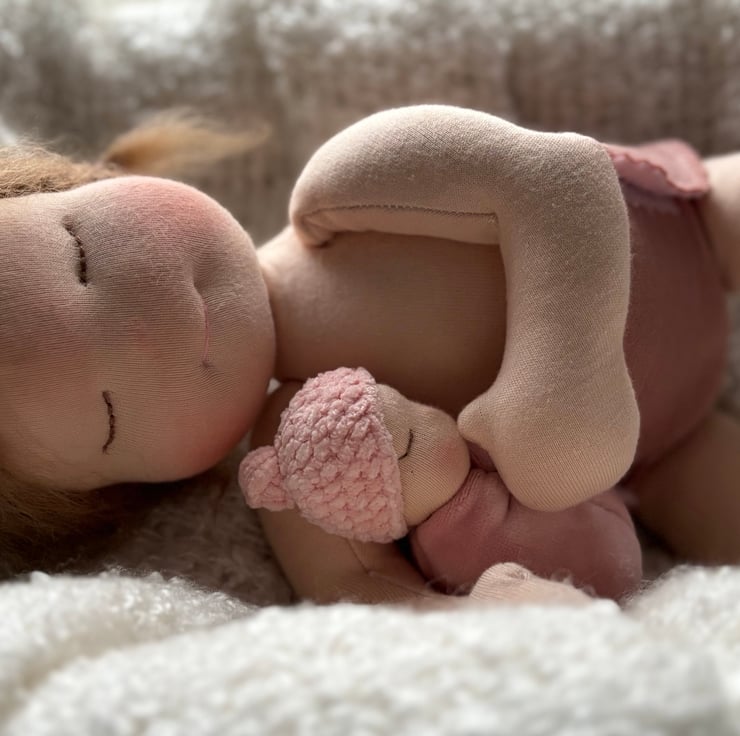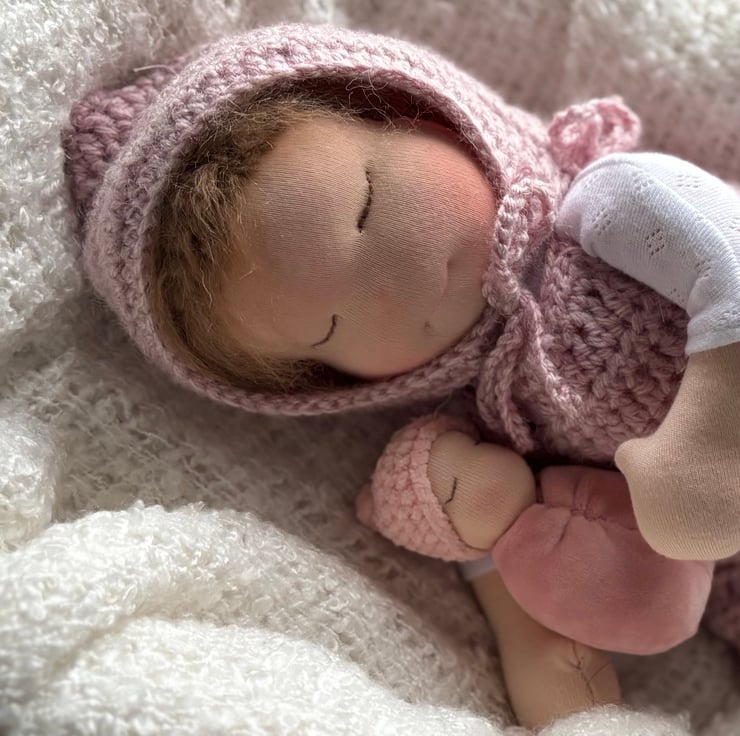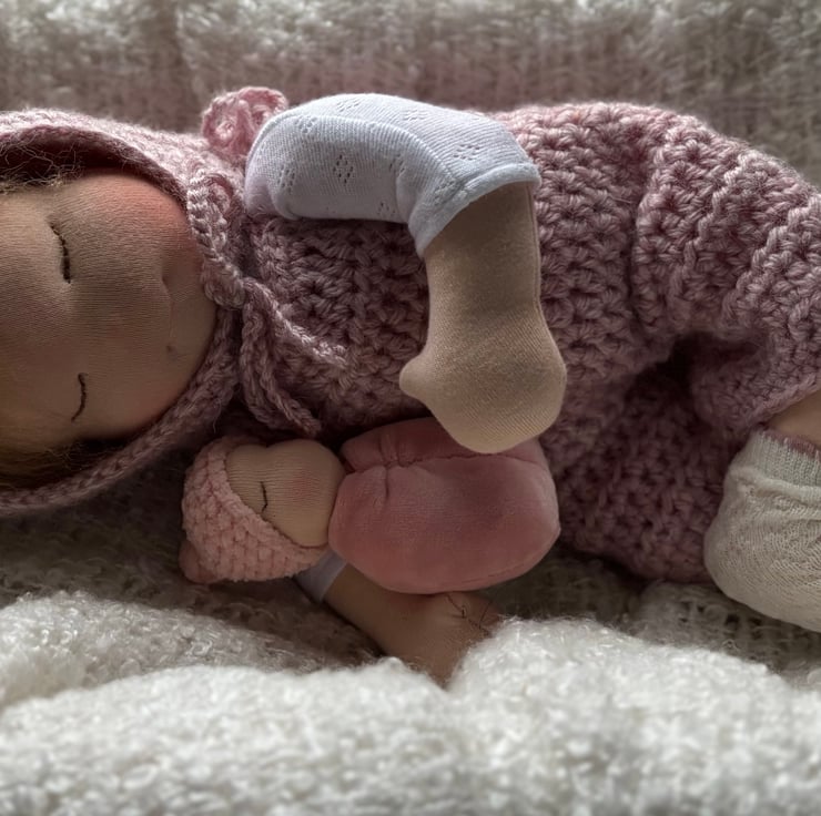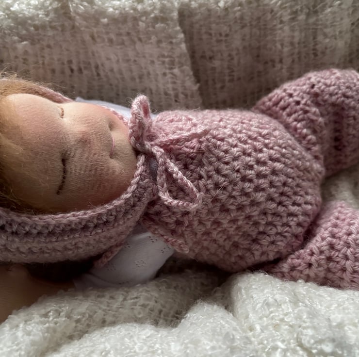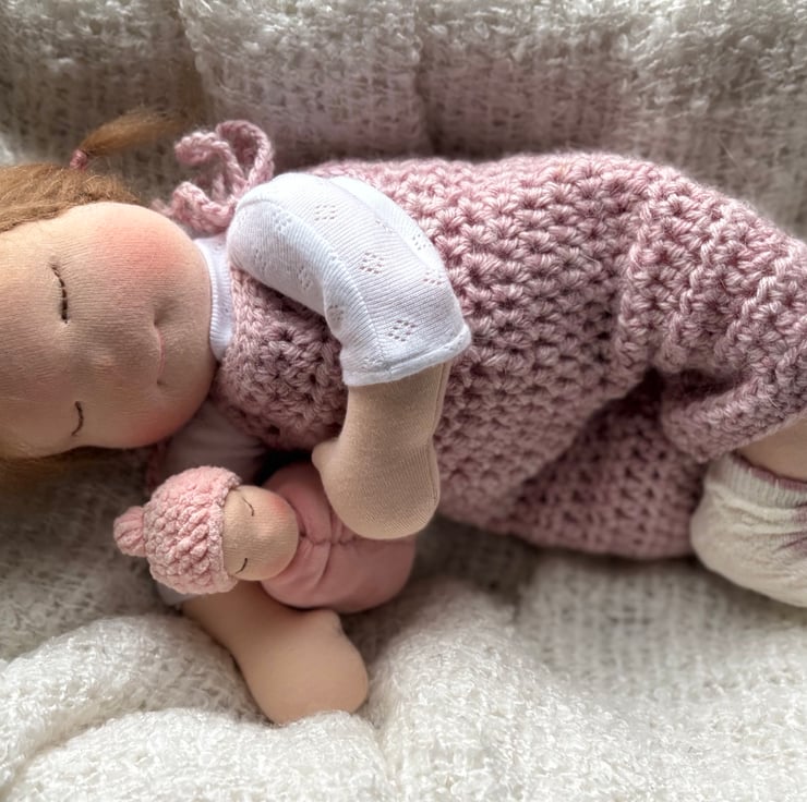 SHe has a cute belly button she comes dressed in a nappy ,socks ,hand crocheted dungarees,matching crochet bonnet and a mini Waldorf baby 4.5” long