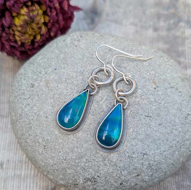 These handmade drop earrings feature mesmerising Aurora Opals set in recycled sterling silver. The teardrop-shaped stones shift between vibrant blues and greens, echoing the colours of the Northern Lights. An oxidised silver frame enhances their depth, creating a striking contrast.