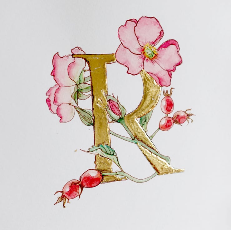 A4 size watercolour original art - wild roses and hips with letter R in 23.5 pure gold carat leaf.