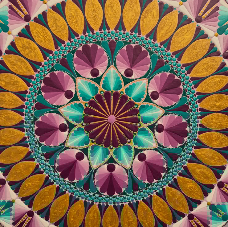 The design features a daisy motif in the centre and has circular floral and abstract symmetrical patterns. Painted in shades of teal, burgundy and gold.