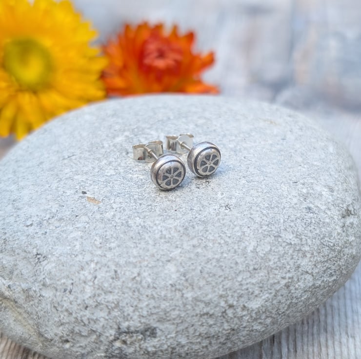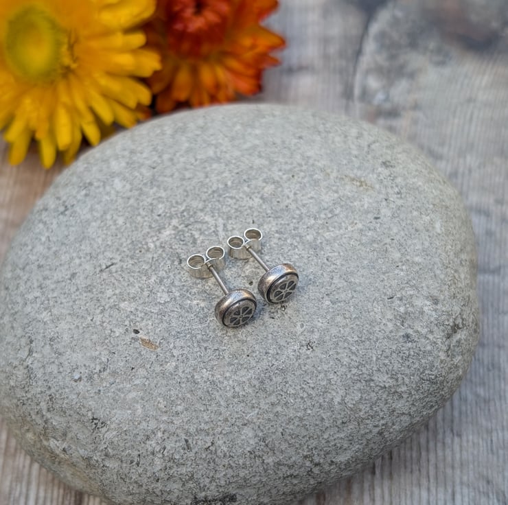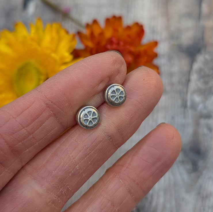 These recycled sterling silver stud earrings are handmade by melting down scrap silver and pressing a delicate flower pattern into the surface. The oxidised finish enhances the design, giving the petals depth and contrast, while the softly rounded edges add to their organic charm. Small yet full of character, they’re a timeless choice for everyday wear.
