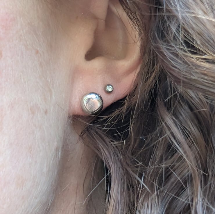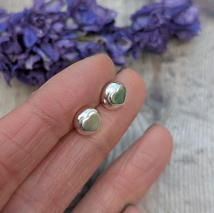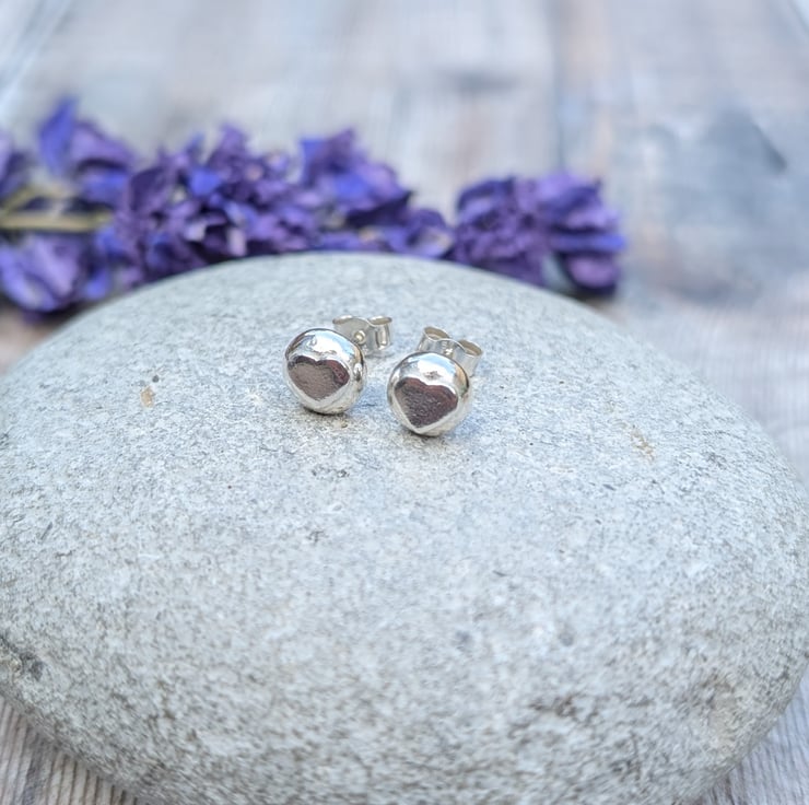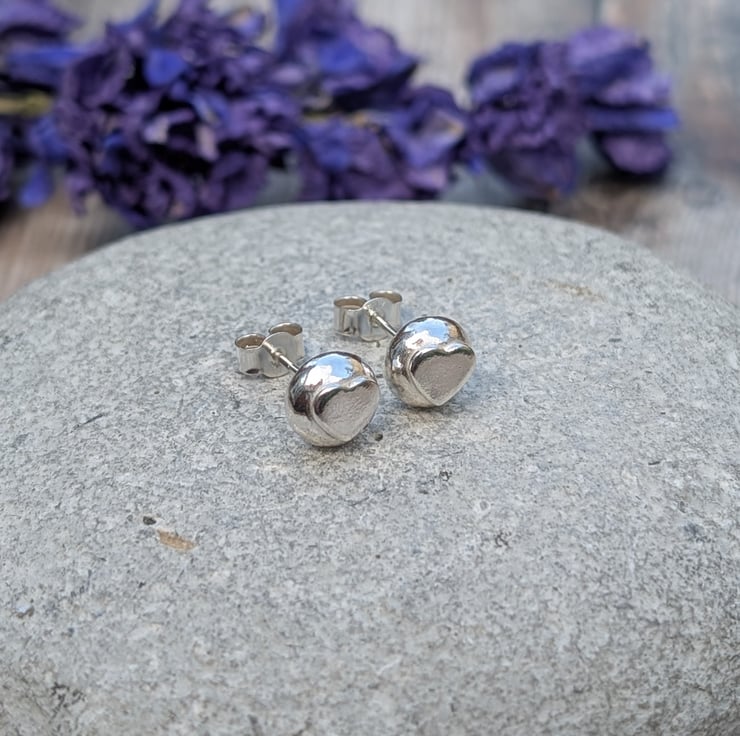 Handmade from melted-down scraps of recycled sterling silver, these stud earrings have a smooth, organic form with a subtle heart detail emerging from their softly rounded surface. Their polished finish reflects the light beautifully, creating a simple yet meaningful design that’s perfect for everyday wear. The handmade nature ensures that each pair is completely unique, with slight variations that add to their charm.