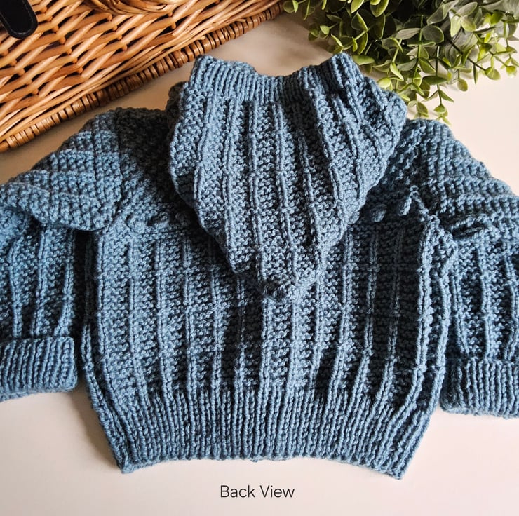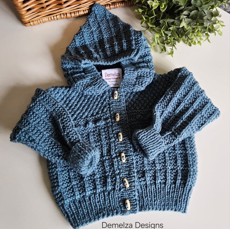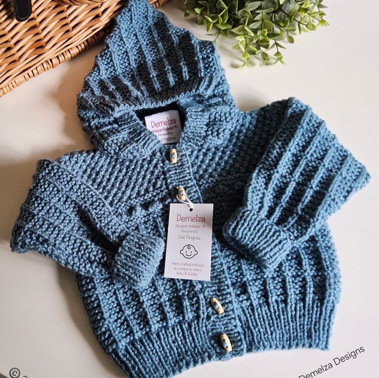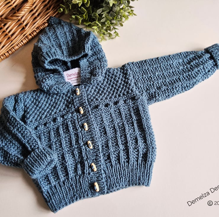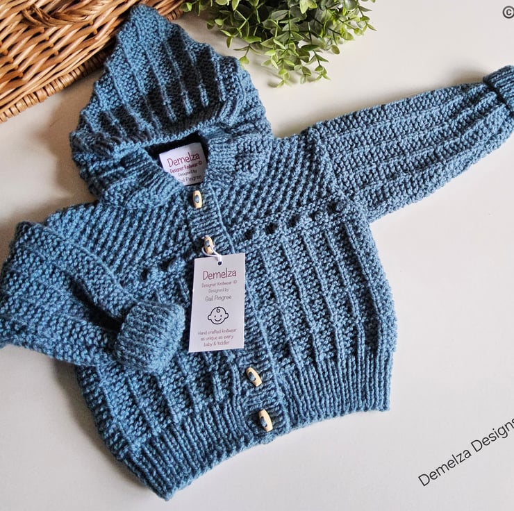 A practical designer baby boy's hand knitted textured hooded jacket lovingly made in Cornwall for those seeking total individuality. It will make a perfect genuine designer baby gift for a new born, baby shower, expecting congratulations gift or for perants looking for quality unique baby knitwear for their little one.