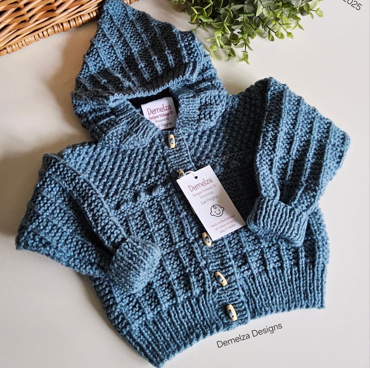 The yarn used is a premium quality machine washable acrylic. Please note: it takes just as long to hand craft a hooded jacket as apposed to a separate cardigan and hat.