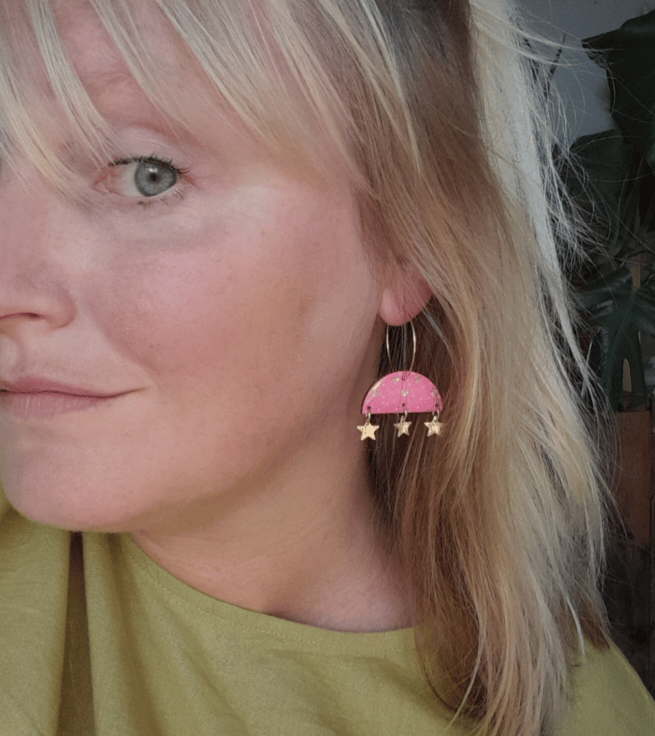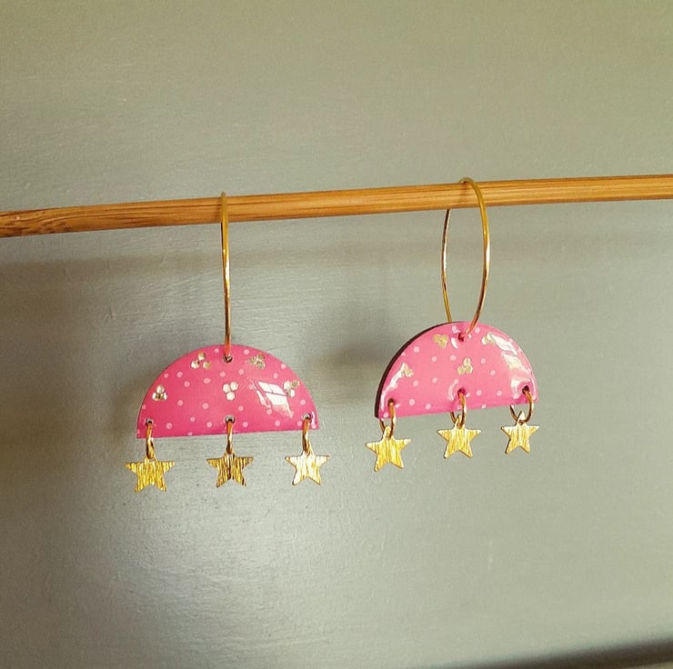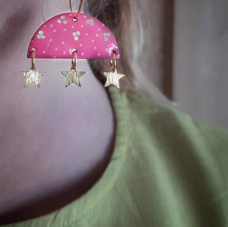 These fun hot pink, sparkly wooden earrings are designed and hand-painted/made by me. With glitter pattern detail and a trio of tiny gold plated stars that twinkle in the light. They are coated with a thin layer of resin giving them an extra shiny finish. The back of each earring has been painted and coated with a matte varnish to protect the paint and wood.