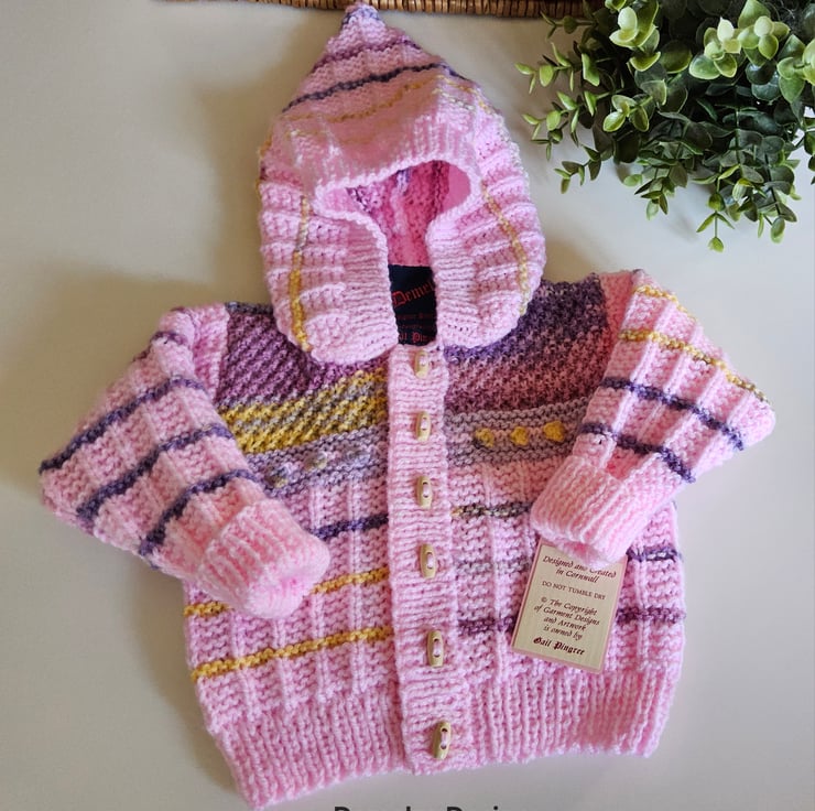 A practical designer baby girl's hand knitted textured hooded jacket lovingly made in Cornwall for those seeking total individuality. It will make a perfect genuine designer baby gift for a new born, baby shower, expecting congratulations gift or for perants looking for quality unique baby knitwear for their little one.