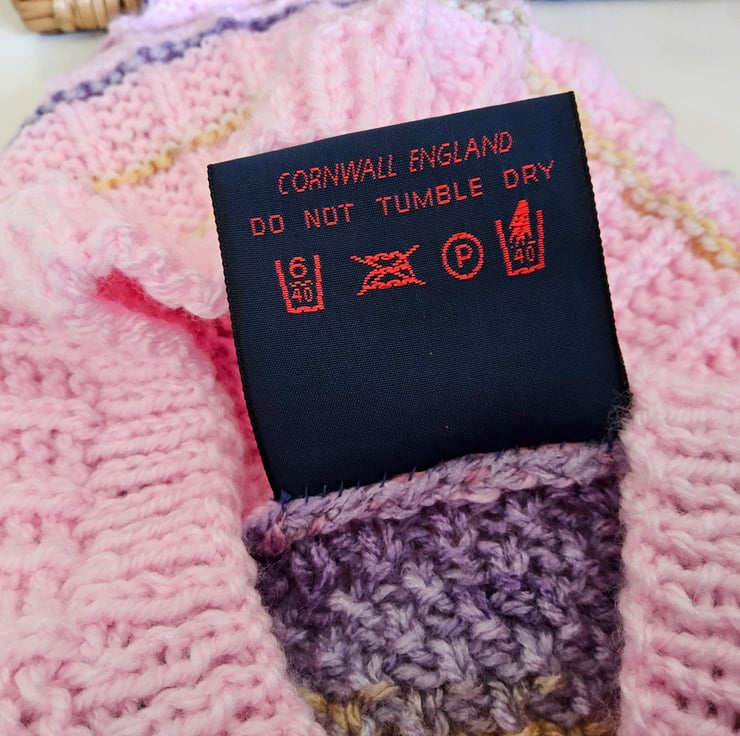 Baby knitwear is designed and hand crafted by Demelza Designs in Cornwall meeting UK baby safety standards, Only branded premuim acylic, acrylic/natural fibre blends or pure natural fibre yarns are used in baby knitwear which conforms to BS984/76 standards.