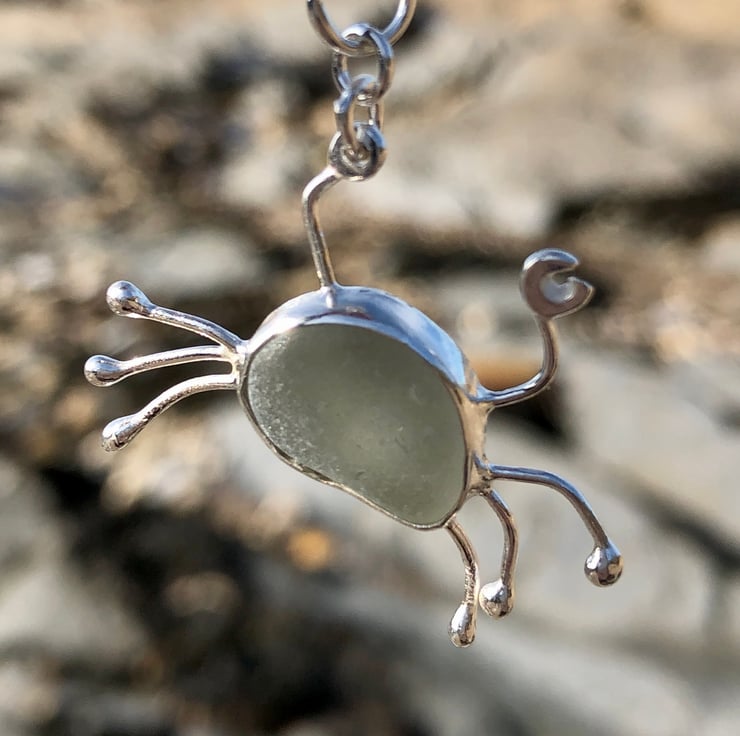 This beautiful piece of frosty white sea glass was found along the UK's South West coastline and has been set in a fine silver bezel (.999) and using recycled (ecosilver) sterling silver wire (.925) to create a beautifully unique crab pendant. This piece has not been hallmarked.