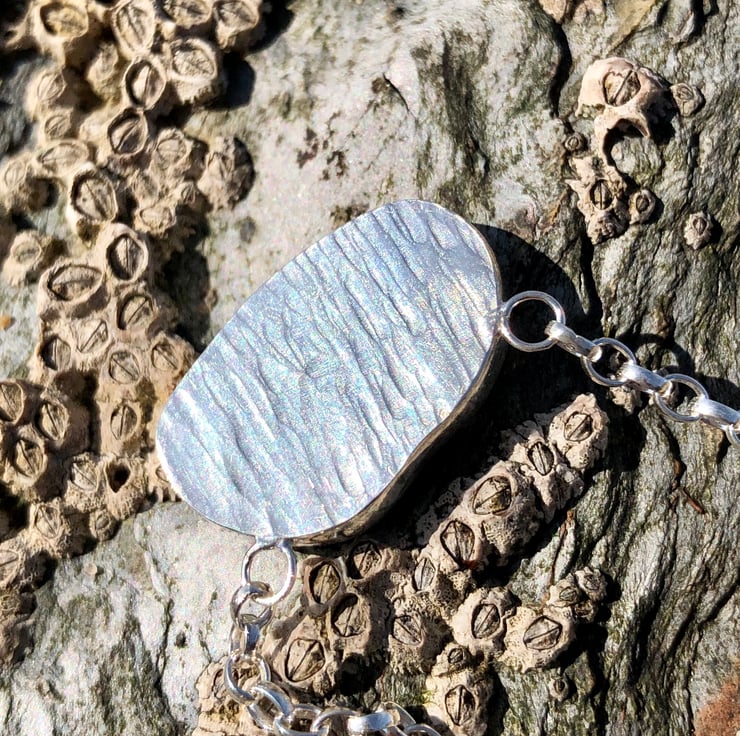 This gorgeous piece of pale aqua blue seaglass was found along the UK's South West coastline and has been set in a fine silver bezel (.999) and backed using recycled (ecosilver) sterling silver (.925). The back of this pendant has been hammered to give a beautiful textured appearance and set on a fixed fixed 2.5mm belcher chain to create a beautifully unique pendant.