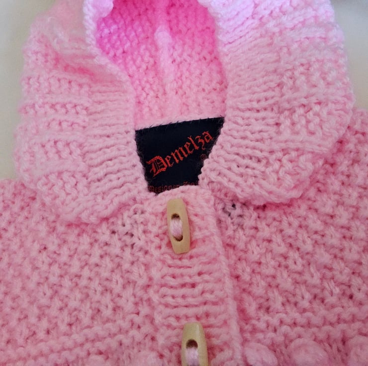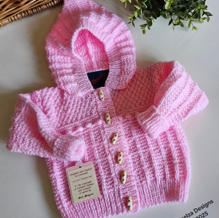 A practical designer baby girl's hand knitted textured hooded jacket made in Cornwall for those seeking total individuality. It will make a perfect genuine designer baby gift for a new born, baby shower, expecting congratulations gift or for perants looking for quality unique baby knitwear for their little one.
