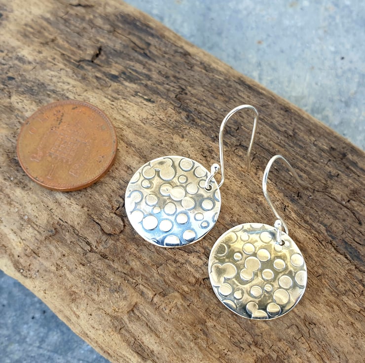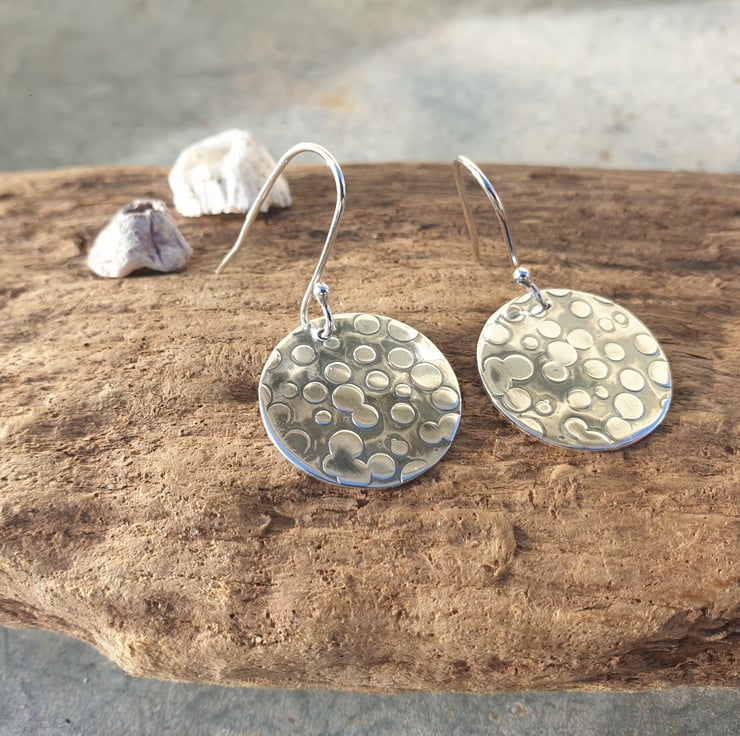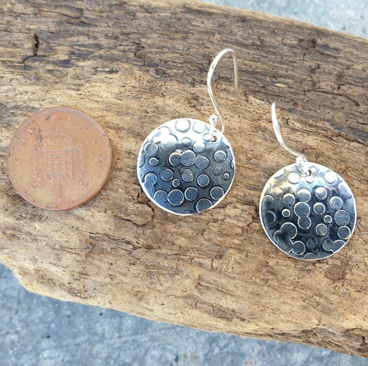 Inspired by the pebble beach at Walberswick on the Suffolk coast, these circular earrings have been textured with lots of little circles, then oxidised to highlight the patterns. They measure approx 2cm across and hang from handmade sterling silver wires.