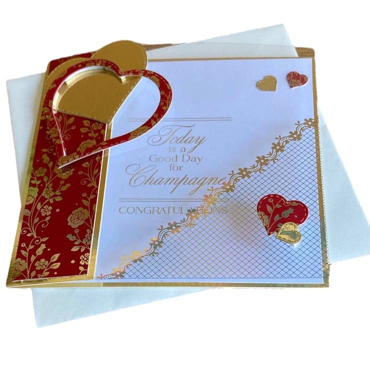 The card features a mat and layer design featuring a gold base overlaid with a red card decorated with gold flowers. The front features a gold foiled acetate panel which reveals the greeting inside which says Today is a Good Day for Champagne, Congratulations.
