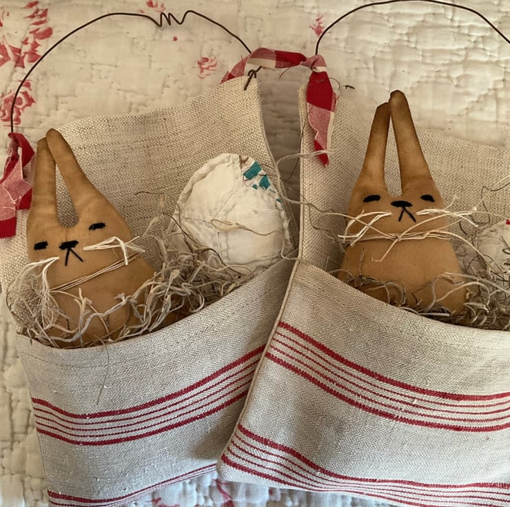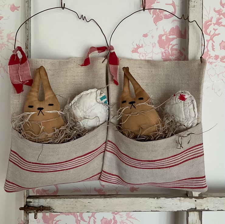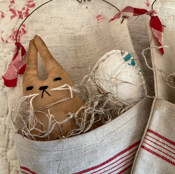 The homespun bunny is made from coffee stained cotton, with embroidered features and a wool fleece bobtail. The pocket also contains an Easter egg, made from antique hexie patchwork quilt, and is filled at the front with Spanish moss.