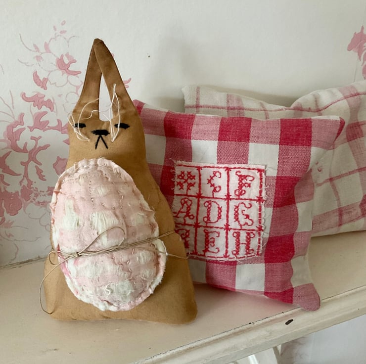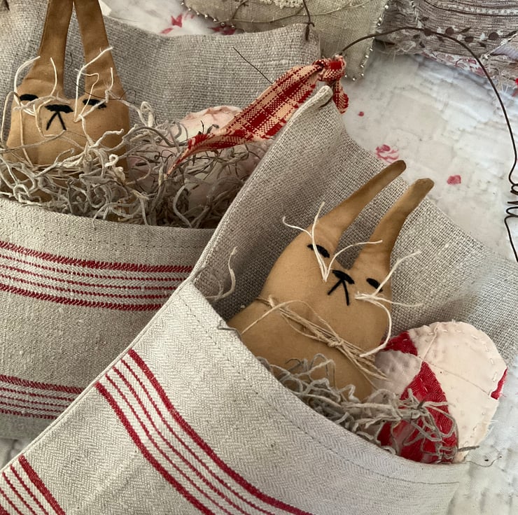 The homespun bunny is made from coffee stained cotton, with embroidered features and a wool fleece bobtail. The pocket also contains an Easter egg, made from antique pink quilt, and is filled at the front with Spanish moss.