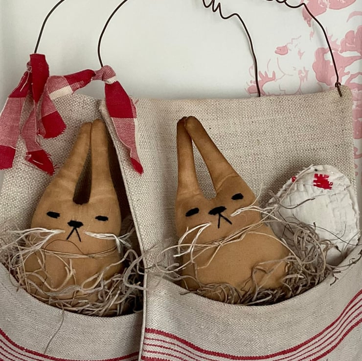 This gorgeous primitive display piece makes a lovely addition to your spring decor and comprises an antique linen pocket, containing lovely handmade pieces.