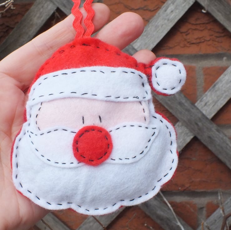 This is a hand sewn felt Father Christmas, Santa Claus decoration which could be hung on your Christmas tree or around your home. The price is for one decoration.