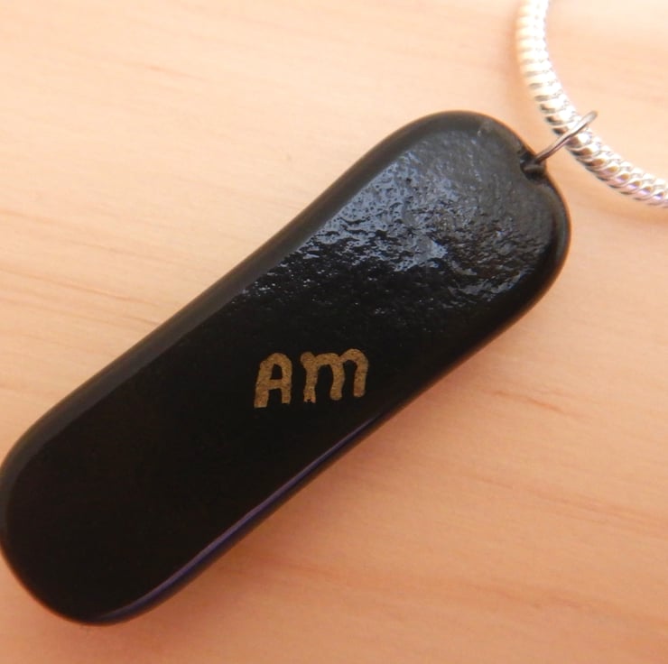This necklace has been made by fusing together two layers of bullseye glass. The hoop for the necklace is fused between the two layers making it impossible to break off.
