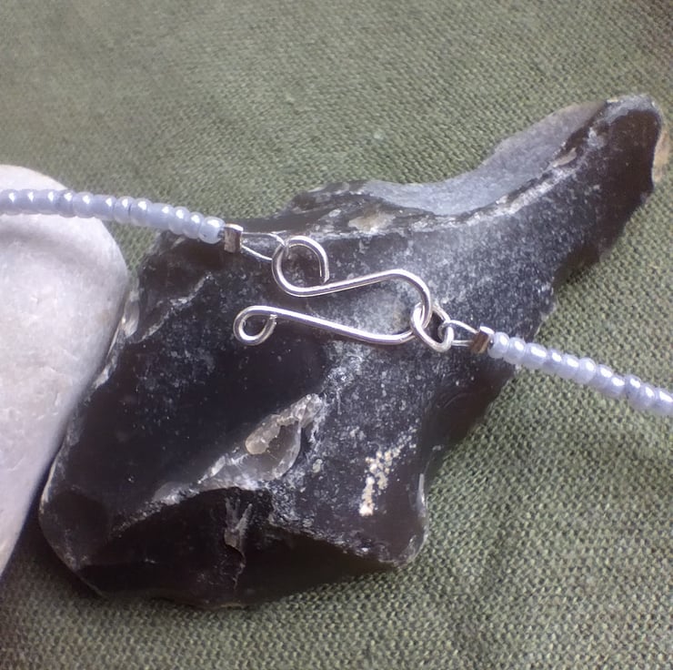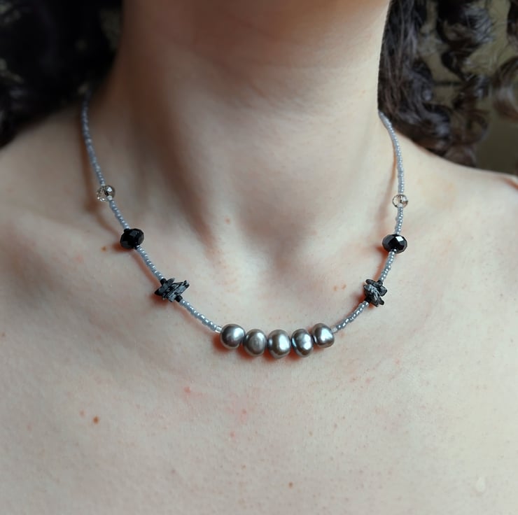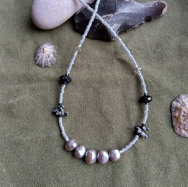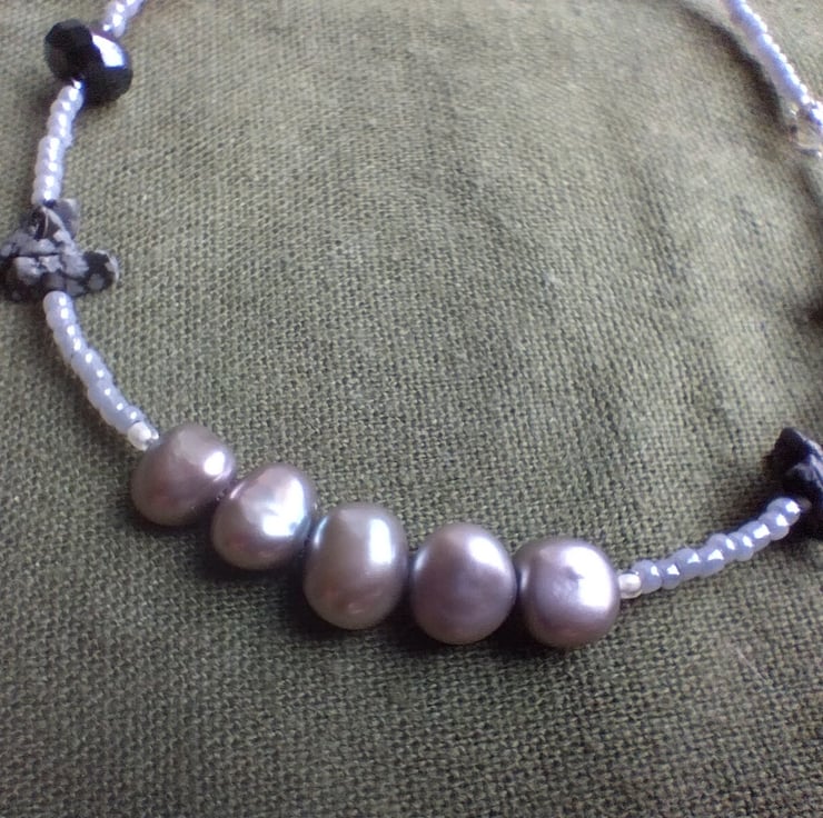 This unique handmade necklace includes at its centre five grey coloured pearls, paired on either side with raw snowflake obsidian pieces, crystal-cut glass beads of black and grey, and grey glass seed beads. It is finished with a hand-shaped clasp made of 925 sterling silver craft wire.