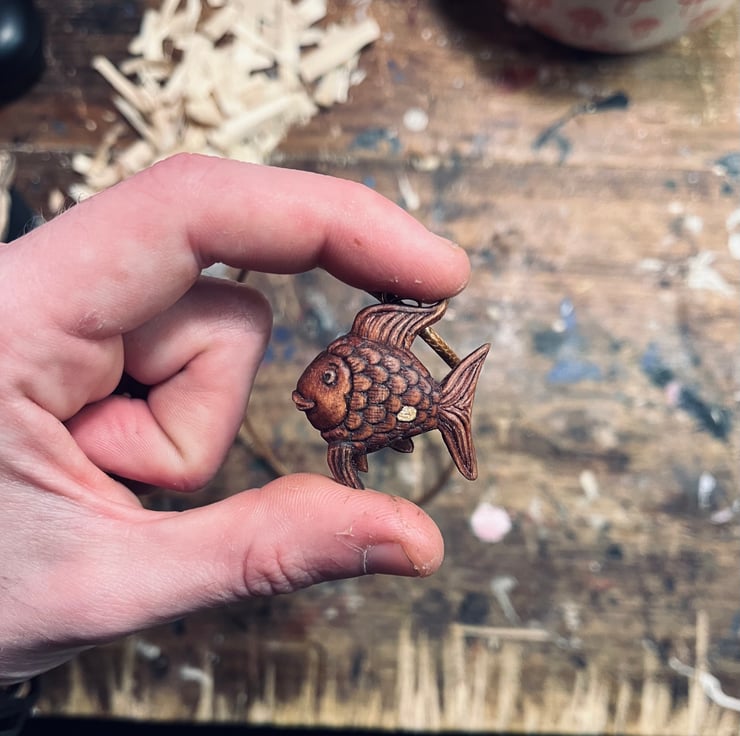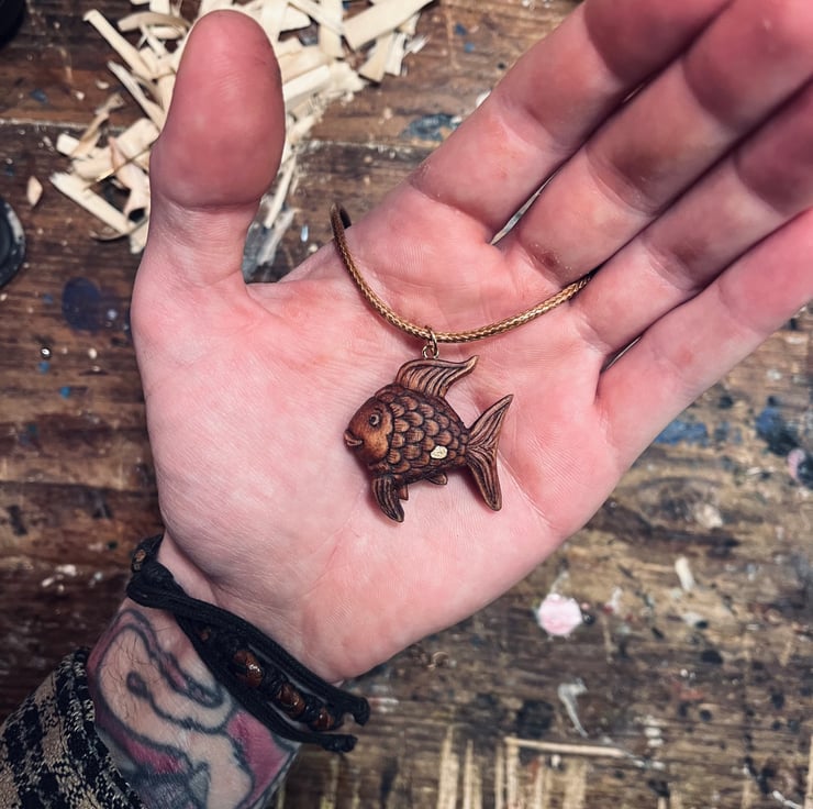 Rainbow Fish is carved from stained alder wood, and measures approximately 1 inch long. He’s attached to a brown wax cord necklace with brass clasps. He’s flat backed, so there’s space on the back to engrave a name, date, or word - just let me know in the comments when checking out if you’d like something engraving (engraving is free by the way!)