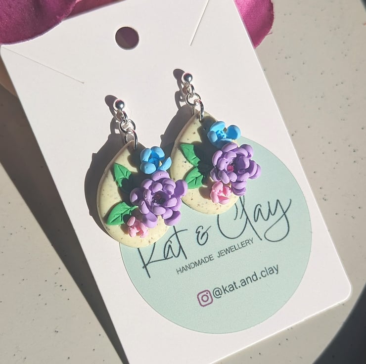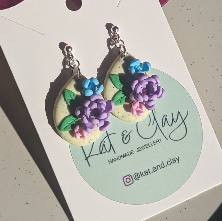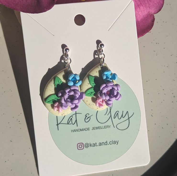 Polymer clay earrings in speckled yellow with pink, purple, and blue flowers. Made from FIMO polymer clay and stainless steel stud fixing.