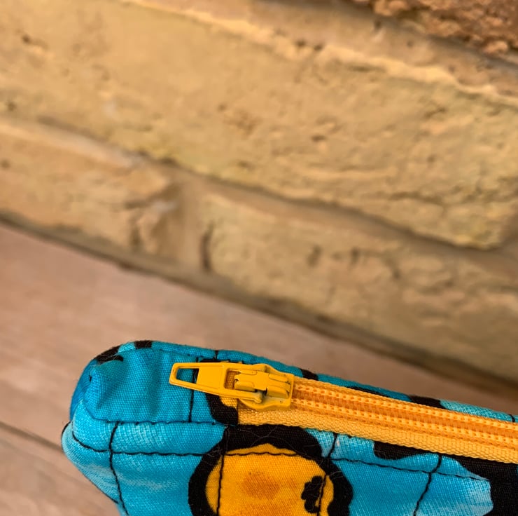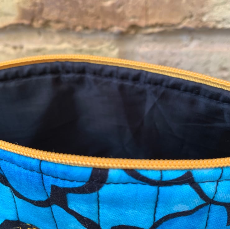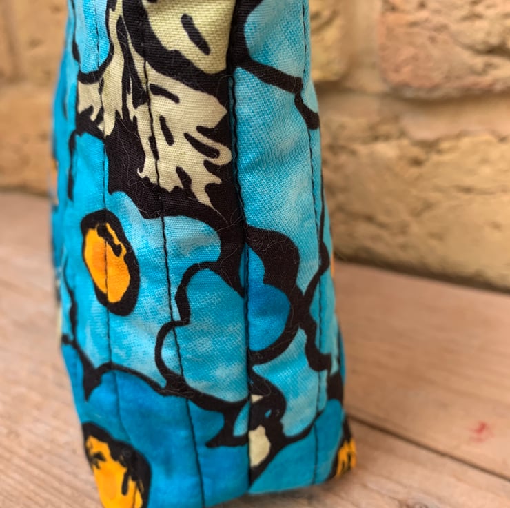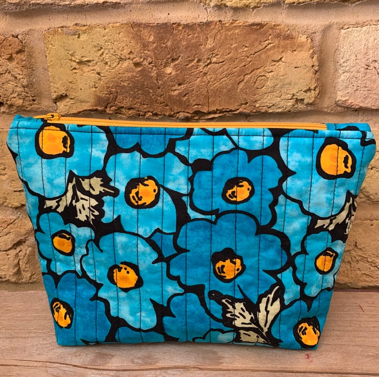 The quilted makeup bag is made from this stunning blue, black and yellow flower print cotton fabric.