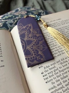 Handmade, dark purple, gold Mandala print polymer clay bookmark, with a gold silky tassel and blue glass bead.