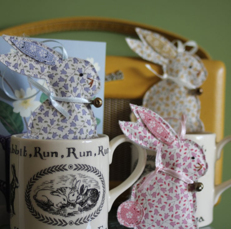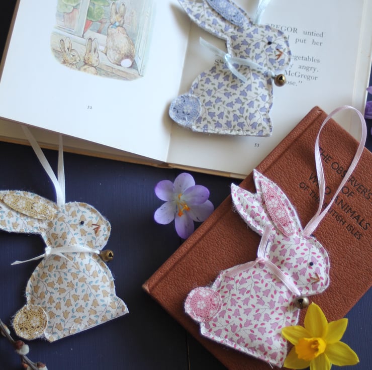 Each bunny has been cut out by hand from odds and ends of leftover fabric and measures approximately 10cm from ear tip to tail. The ear and tail details have been cut out from contrasting fabrics and I have stitched an eye and whiskers on by hand. They contain a layer of polyester wadding to give a lightly padded effect and have a hanging loop made from co-ordinating satin ribbon. As a finishing flourish each has a teeny brass jingle bell fastened around the neck with matching ribbon.