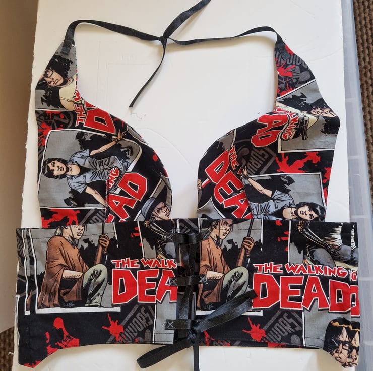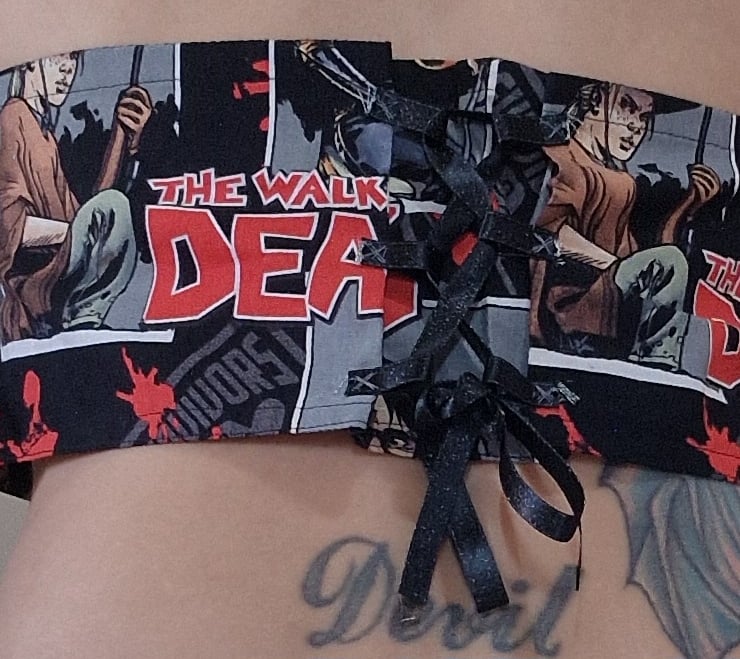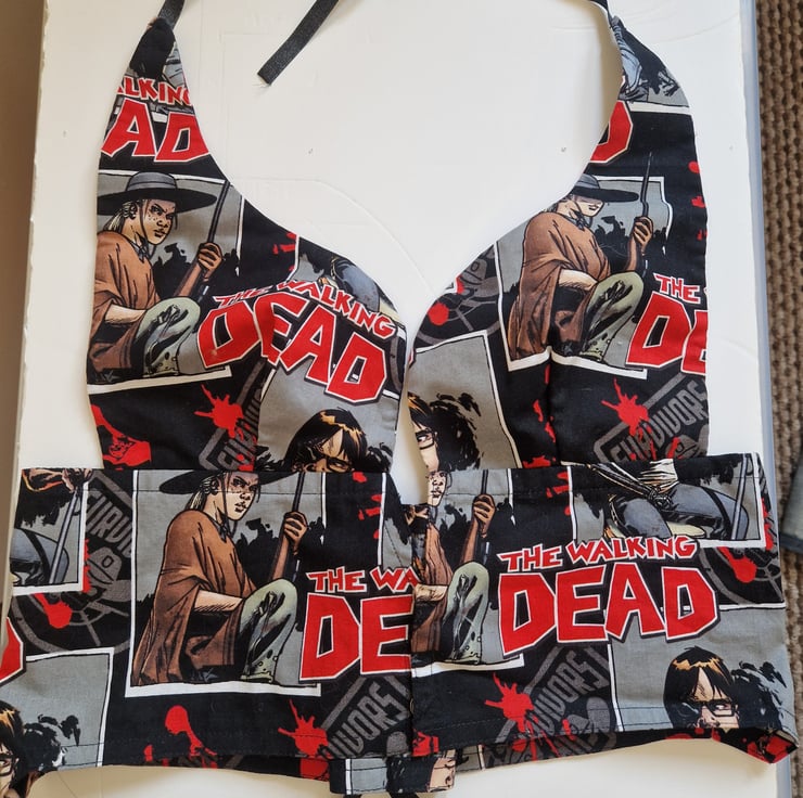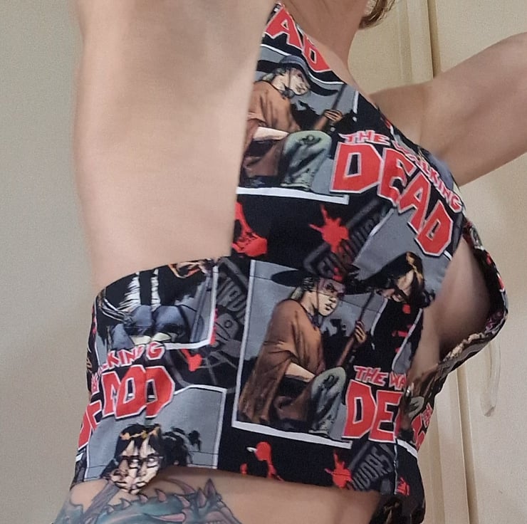 I absolutely love The walking dead, and when I took a sewing class in Exeter the lady owning the shop was also a fan, she had this awesome material.... and this is what my brain came up with! Very versatile top, can be worn with or without an under garment, causal, sexy and quirky.
