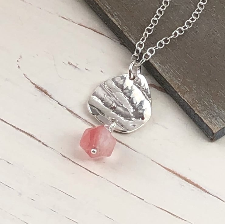 Pretty sterling silver pendant with a fire cherry quartz bead drop hung on an 18" silver chain. The surface of the silver has been hammered and formed into gentle ridges. Evocative of ripples on water, it catches the light beautifully as you move.