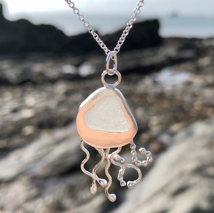 This beautiful piece of frosted white sea glass was found along the UK's South West coastline and has been set in a fine silver bezel (.999) and using recycled (ecosilver) sterling silver wire (.925) to create a beautifully unique Jelly fish pendant. The back of the pendant has been left open so that the gorgeous colour of the sea glass can shine through.