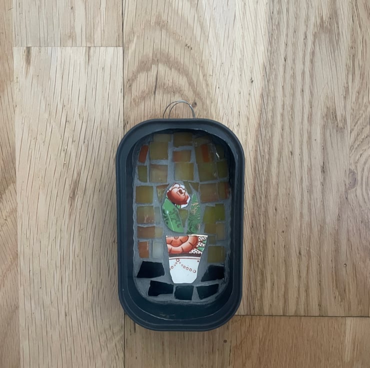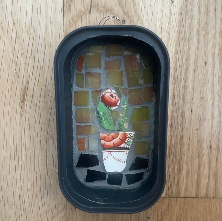 Mini mosaic in sardine tin. Unique artwork made in East Sussex with lots of love. Made out of broken china plates and little mosaic glass squares. Would make a lovely gift and looks great in kitchen, hallway or any other room. With wire loop on the back for easy hanging options.