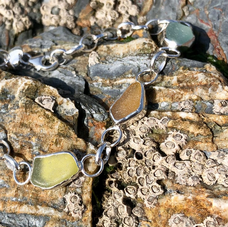 This stunning sea inspired bracelet has been created using sea glass that represents the sea shores. Each colour of sea glass was individually selected and together form a unique bracelet.
