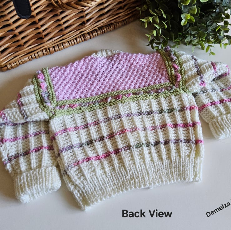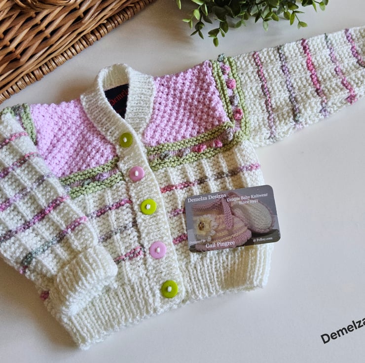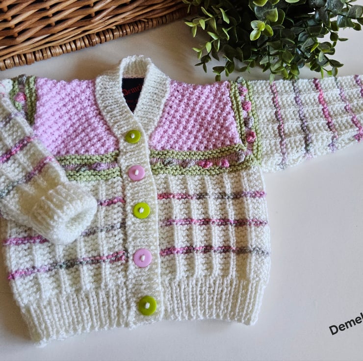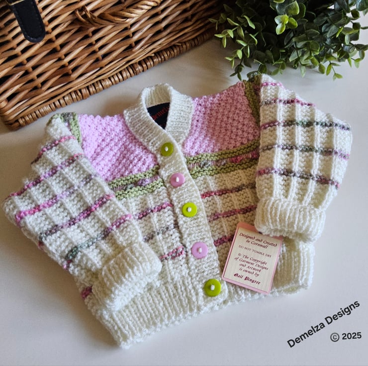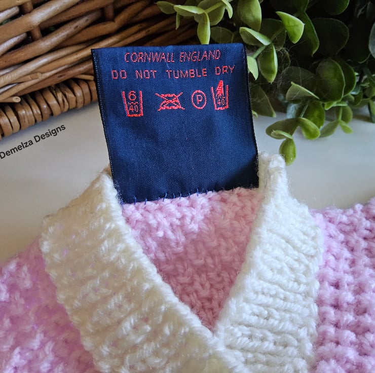 A unique eye catching practical baby cardigan designed and totally hand crafted in Cornwall using top quality premium branded designer acrylic machine washable yarns. The buttons are made from genuine wood with a sweet little flowers burnt etched on them.The branded Demelza Designs garment label is attached to the back neck edge with the care instructions woven within it on the reverse side for lasting reference. A Demelza Designs garment swing tag will be attached to the front prior to dispatch for a professional touch if gifting.