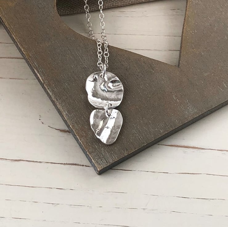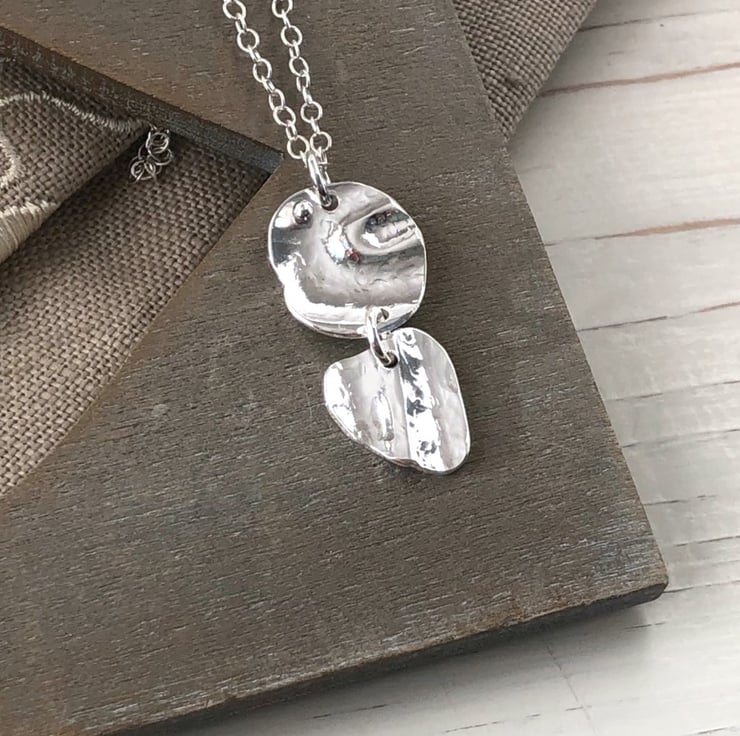 Pretty pendant with 2 silver drops hung on an 18" sterling silver chain. These randomly shaped little silver drops have a hammered and undulating surface reminding me of ripples on water, as with water they catch the light beautifully when you move.